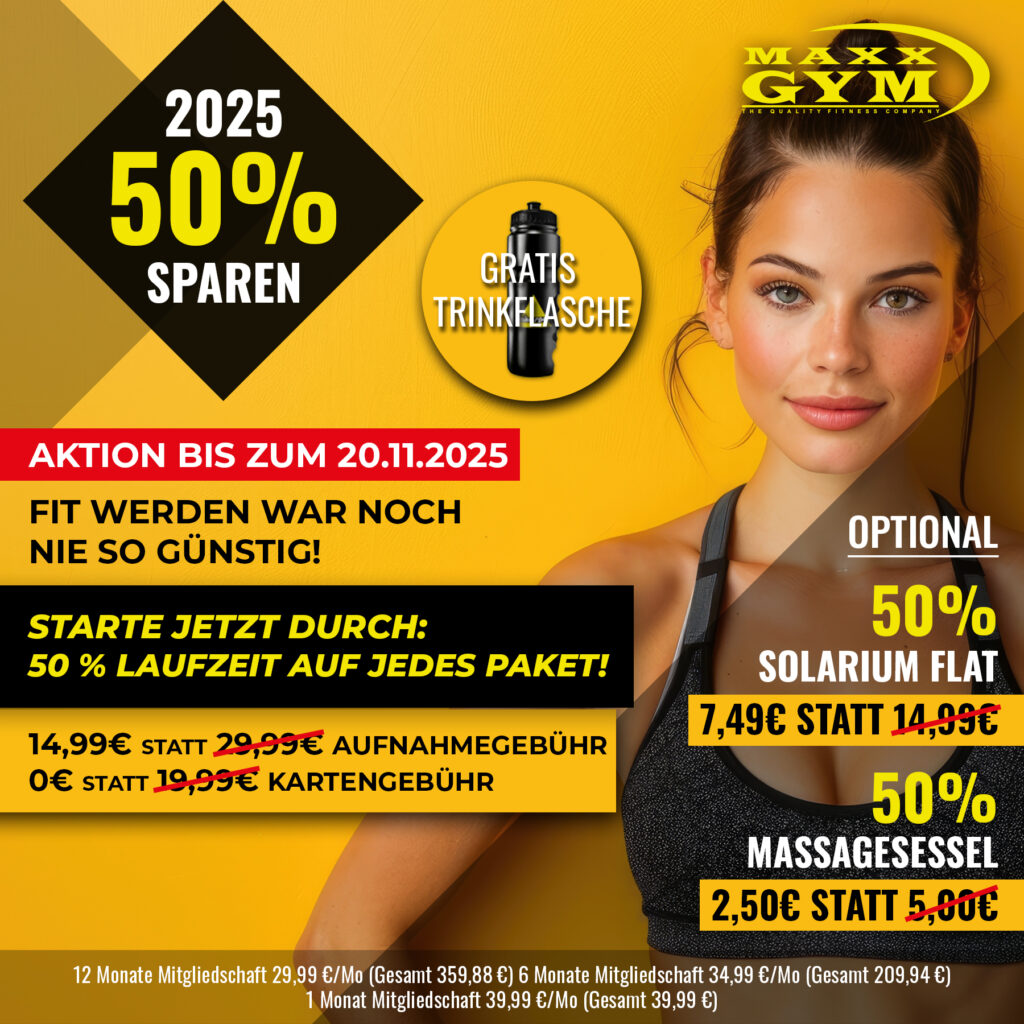 #MaxxGym #Neubrandenburg #Fitness2025 #50ProzentRabatt #Aktion2025 #Sonderangebot #TrainHard #FunctionalTraining #LadyFitness #Sauna #Solarium #Massagesessel #Gruppenkurse #Motivation #Fitnessstudio